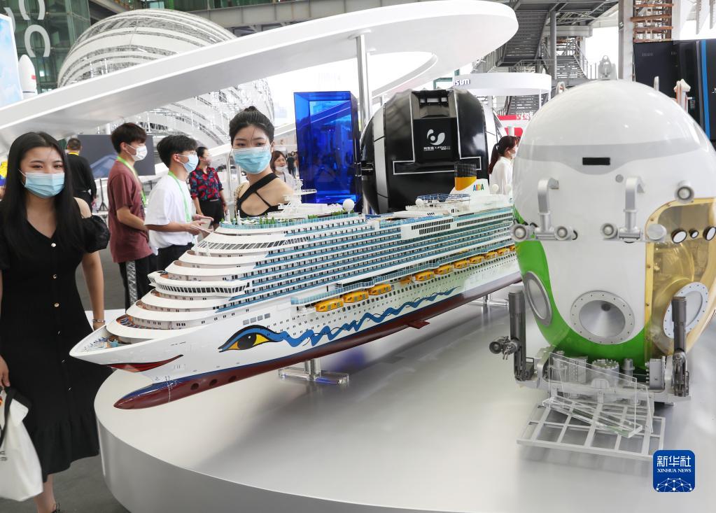 9月16日,参观者在大会上一组船舶设计作品模型前驻足观看。