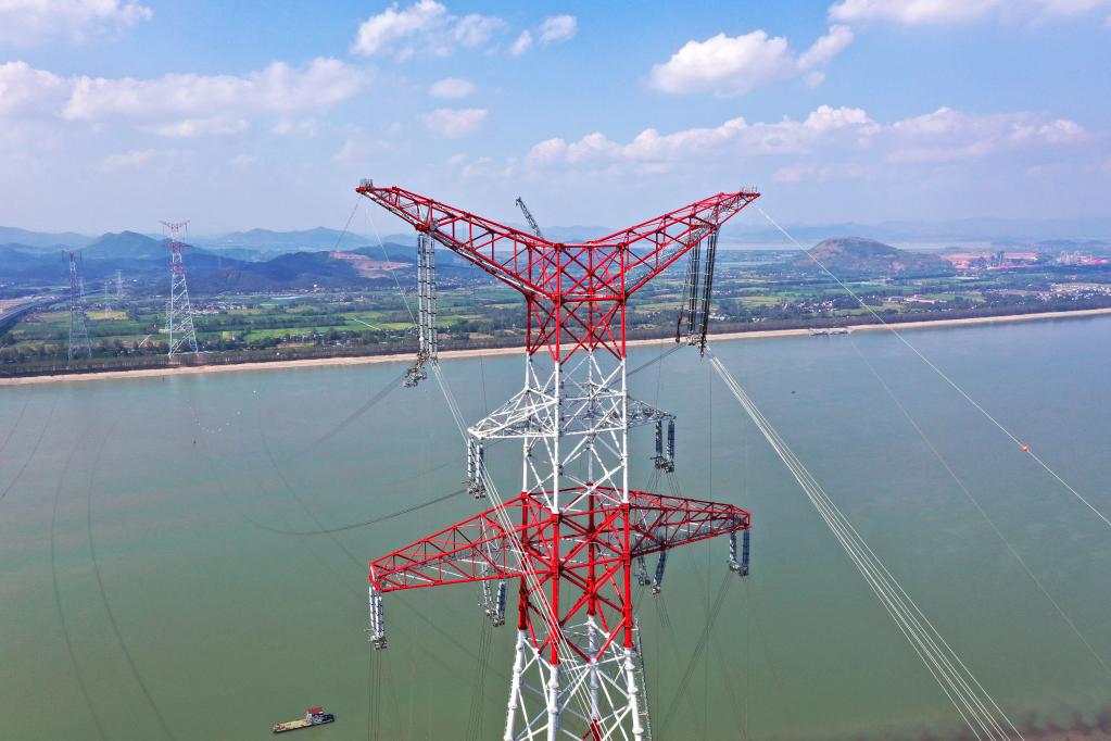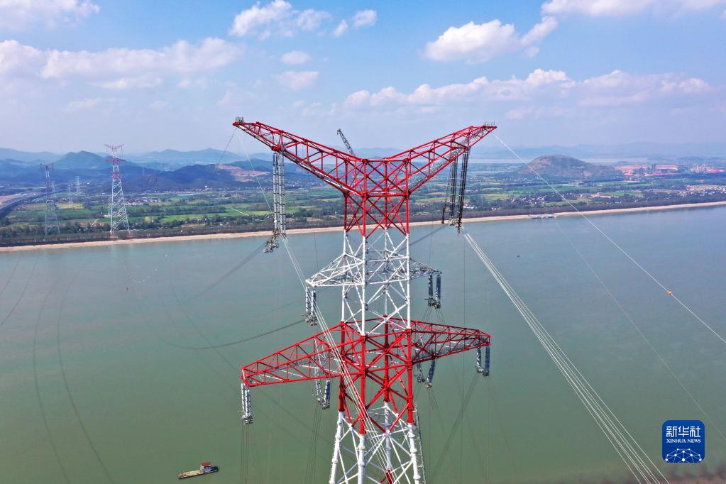 9月16日拍摄的白鹤滩至浙江±800千伏特高压直流输电工程(白浙线)安徽段长江大跨越施工现场(无人机照片)。