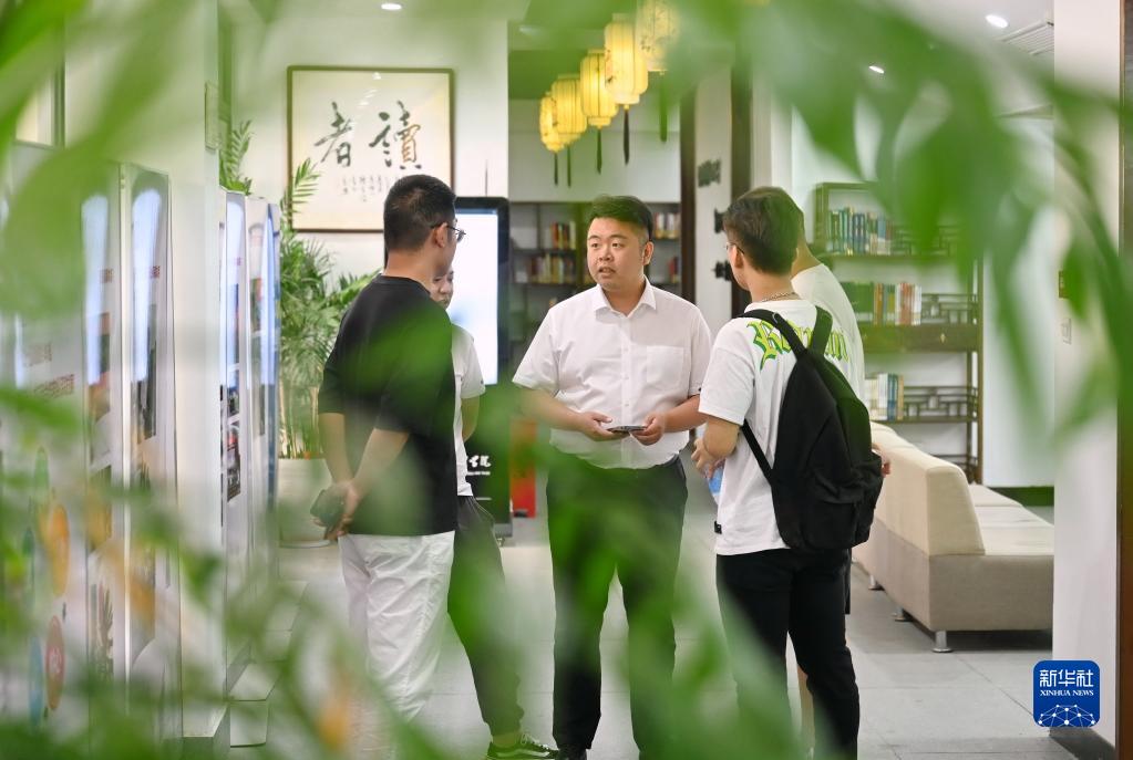9月16日,林俊杰(中)在福州外语外贸学院与在校大学生创新创业团队成员交流。