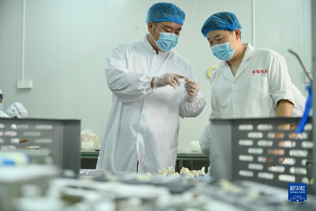9月16日,林俊杰(左)在位于闽侯县祥谦镇中院村的扁肉生产车间指导工人管控产品质量。