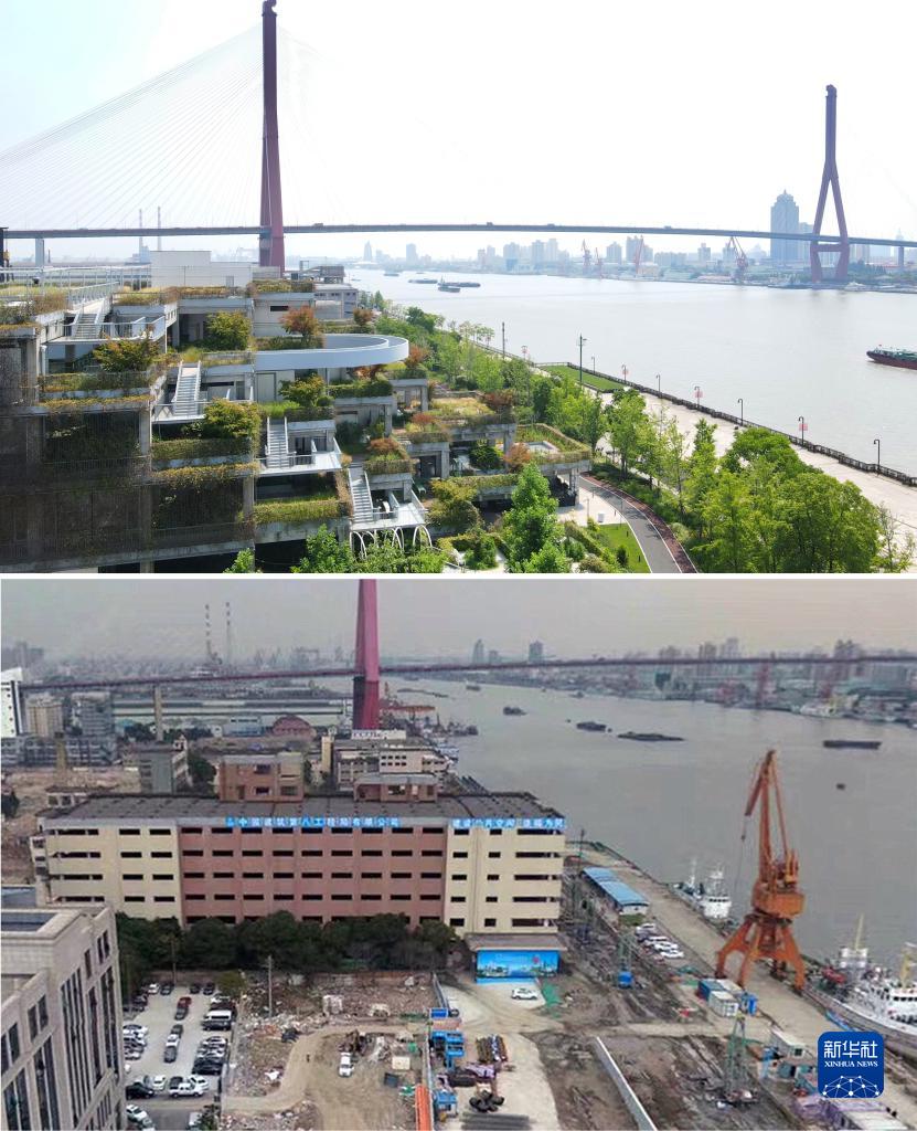 拼版照片:上图为2022年7月12日拍摄的由烟草公司机修仓库改造的公共空间“绿之丘”(无人机照片,新华社记者方喆摄);下图为2016年拍摄的改造前的旧貌(资料照片)。
