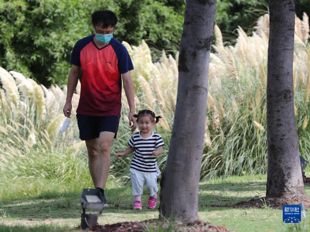 2022年8月28日,小朋友在家长的陪伴下,在杨浦滨江雨水花园玩耍。