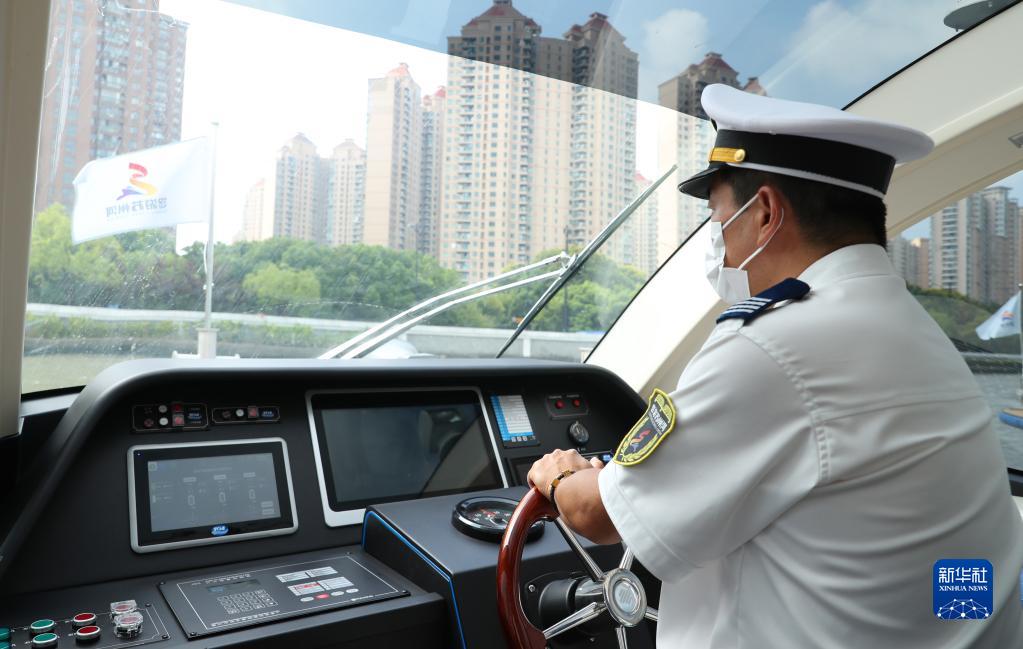 9月17日,在上海长风公园码头,驾驶员操作旅游观光船准备启航。