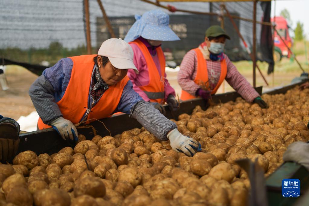 近日,位于库布其沙漠腹地的内蒙古自治区鄂尔多斯市杭锦旗阿木古龙健康产业园内的土豆迎来丰收季,工人们筛选、装运土豆,一派繁忙景象。近年来,杭锦旗通过技术改良提高沙地利用价值,开展土豆等农作物种植,促进当地农业发展。