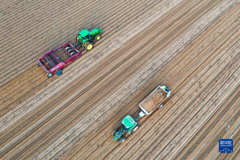 农机在杭锦旗阿木古龙健康产业园内收土豆(9月16日摄,无人机照片)。