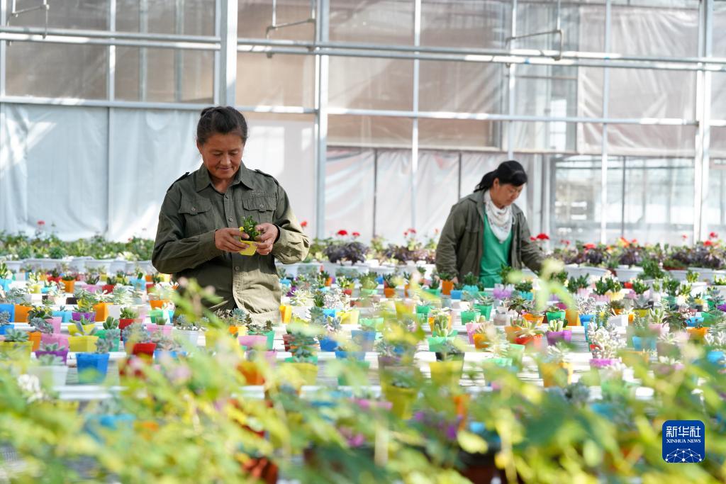 农民在兴十四村现代农业示范园区大棚温室中管理花卉作物(9月16日摄)。