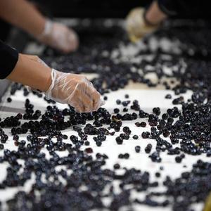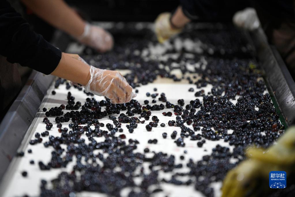 9月16日,工人在宁夏银川市贺兰山东麓的沃尔丰酒庄清洗、分拣酿酒葡萄。
