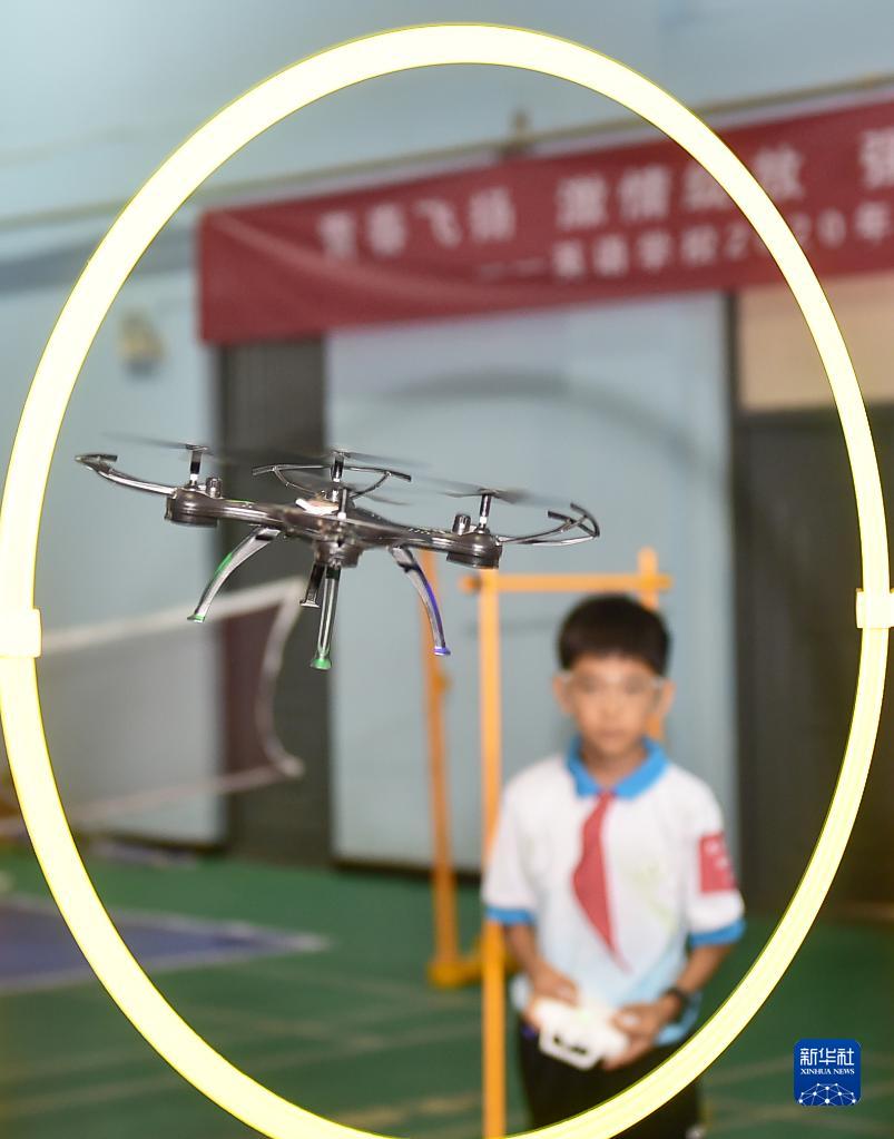 9月17日,学生在河南洛阳市涧西区第二届中小学科创节上参加“回旋飞行”项目。