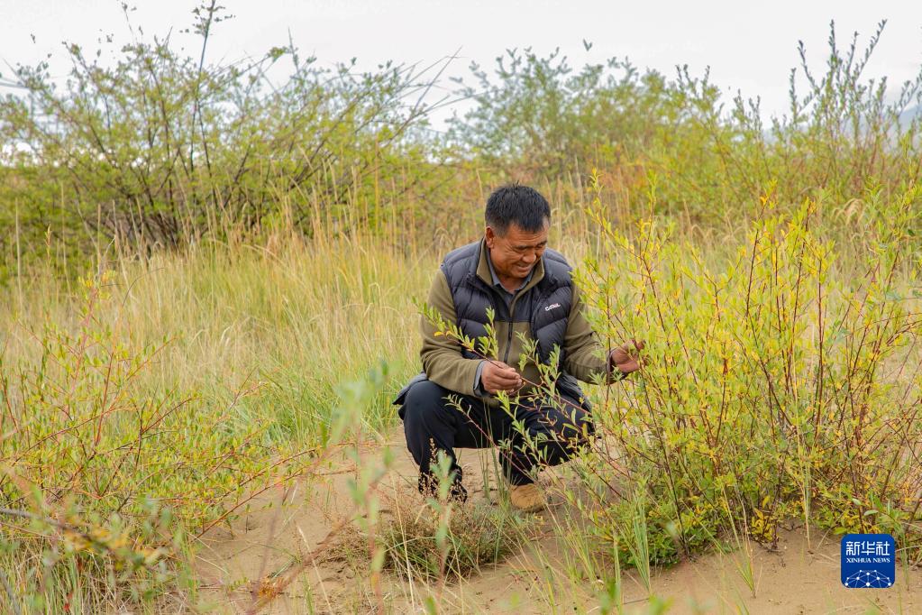 牧民卓玛加布在黄河玛曲段干流沿岸一处沙丘上查看他参与种植的灌木生长情况(9月16日摄)。