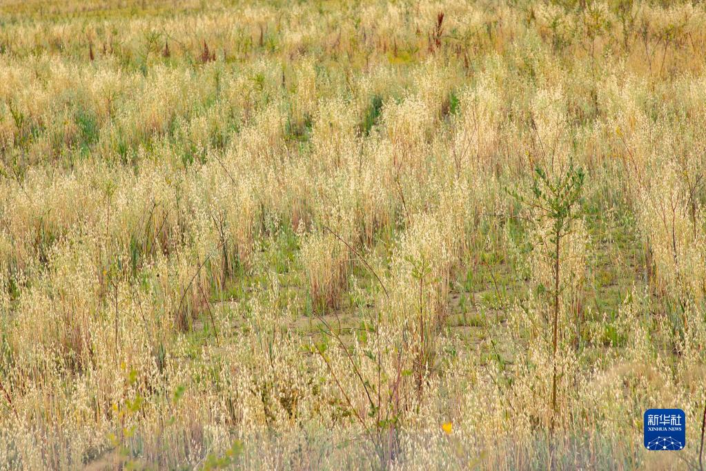 这是黄河玛曲段干流沿岸一处阻沙林带建设区域的草方格沙障内的植被(9月16日摄)。