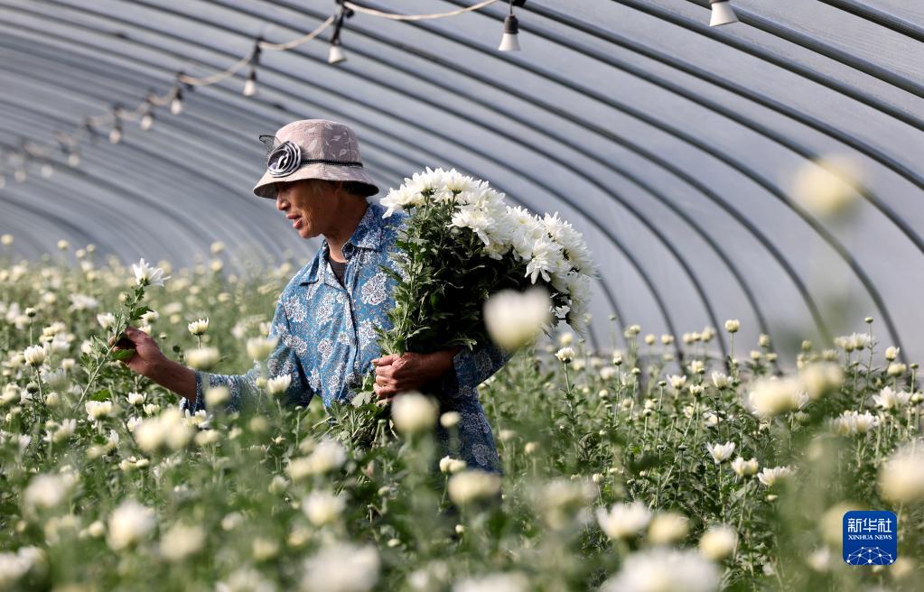 9月17日,山东省枣庄市光明路街道十里泉村农民在大棚里采收菊花。
