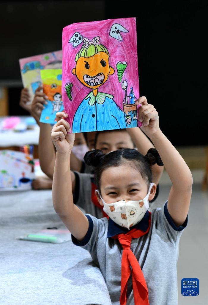 9月19日,在河北省石家庄市西古城小学,孩子们在展示迎接爱牙日主题绘画作品。