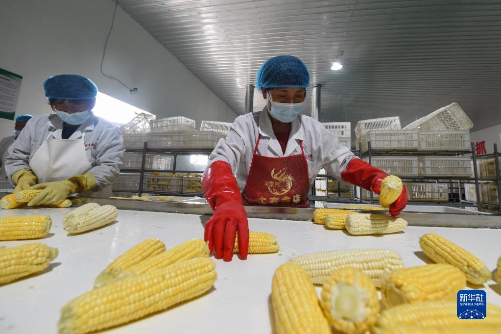 9月20日,在准格尔旗一家食品加工厂内,工人在分拣玉米。