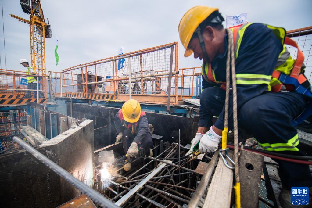 9月20日,在安化县马路口资水特大桥施工现场,工人在进行主墩封顶作业。