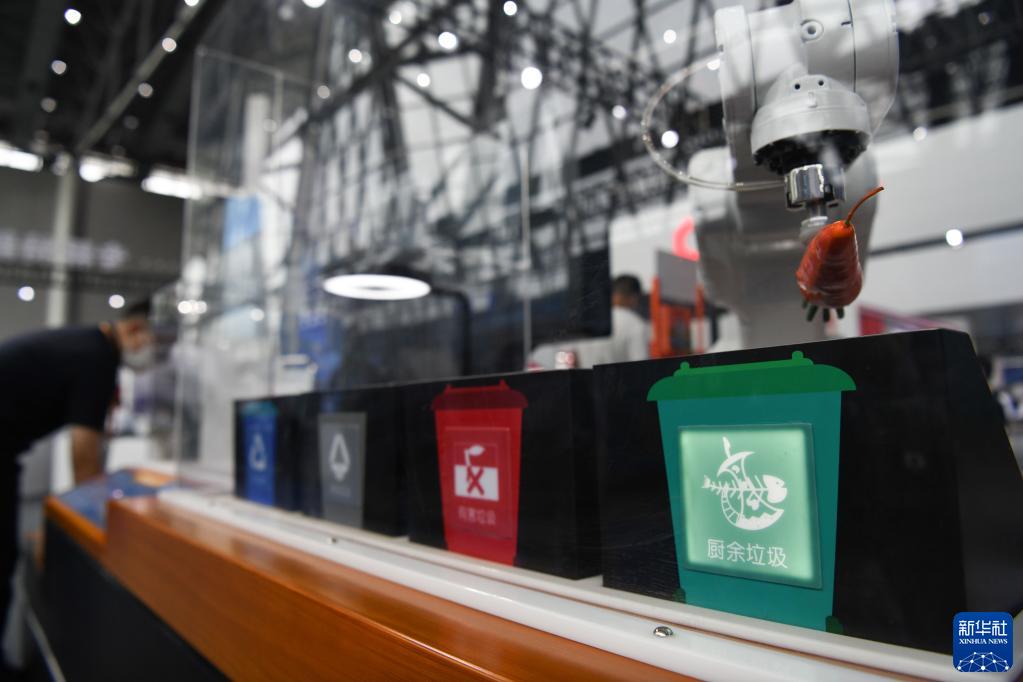 9月20日拍摄的2022世界制造业大会上展出的一款垃圾分类机器人。