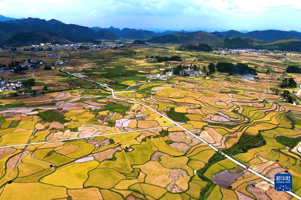 贵州省龙里县湾滩河镇的水稻陆续成熟,田园一派丰收景象(9月17日摄,无人机照片)。
