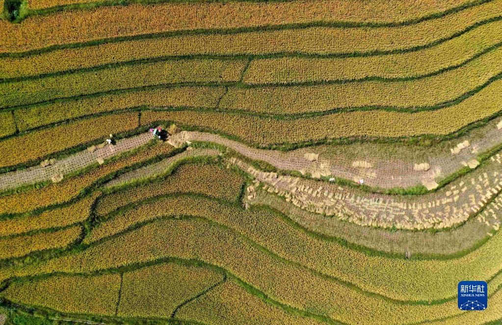 9月18日,村民在贵州省贵阳市开阳县温泉村收割水稻(无人机照片)。