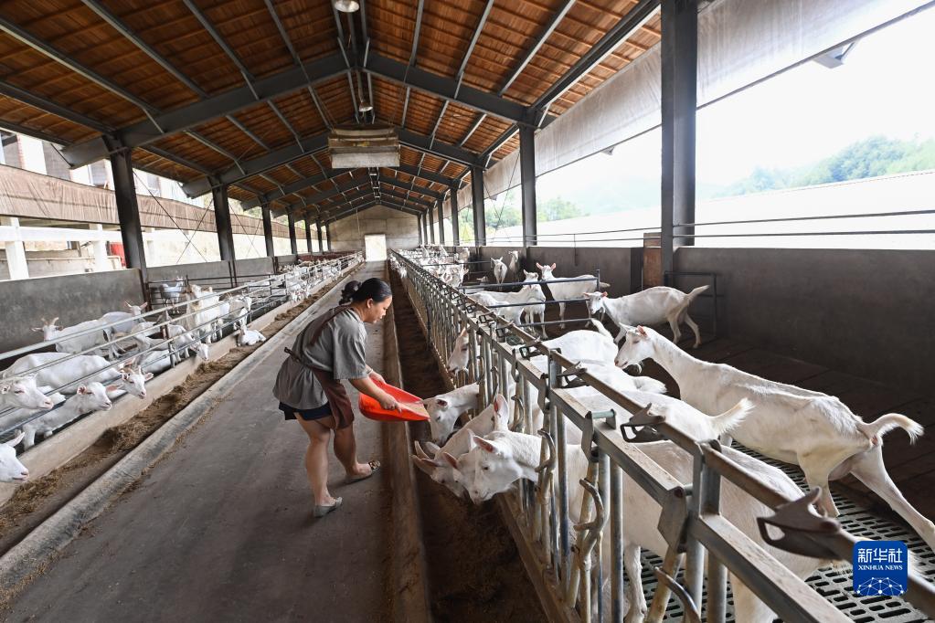 9月21日,在杭州市临安区昌化镇后营村的牧羊谷,张东莉给羊喂玉米粉。张东莉与丈夫共同创办的牧羊谷羊场存栏湖羊和山羊2000多只,是集现代化养殖、旅游、餐饮于一体的新型畜牧企业。