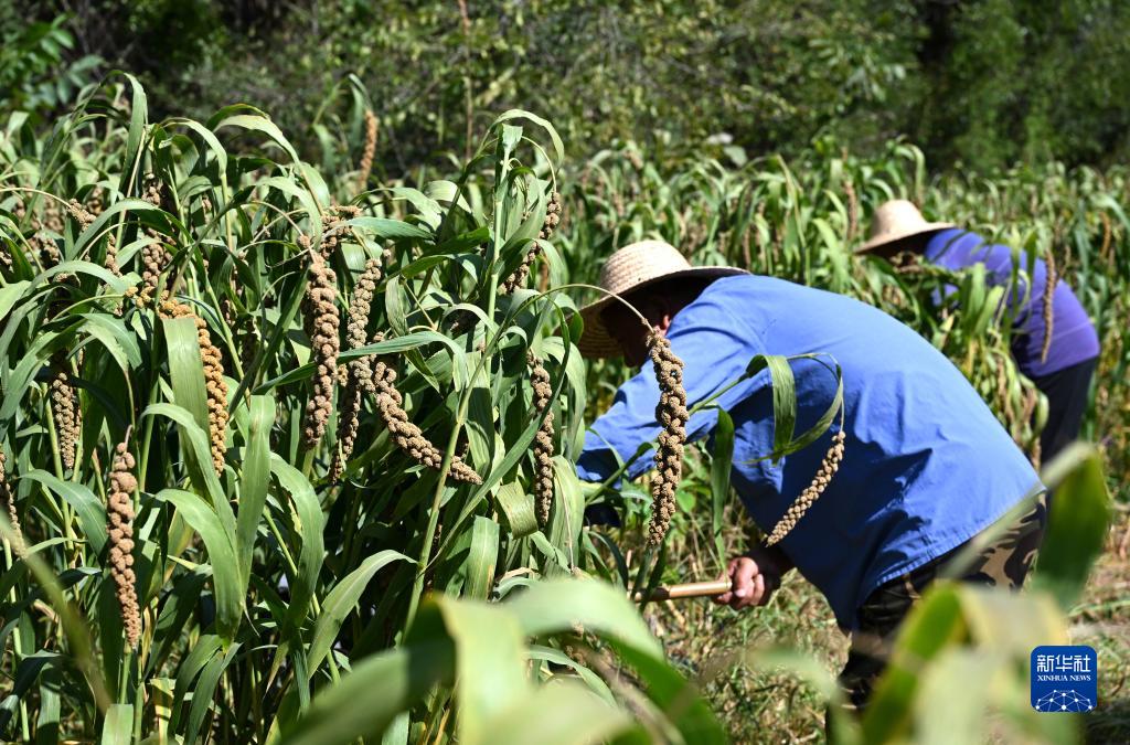 9月21日,天津市蓟州区罗庄子镇泥河村村民在收割谷子。