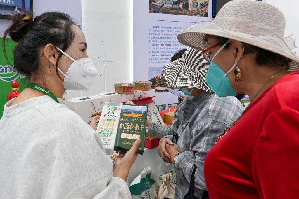 9月21日,在第七届中国-亚欧博览会上,参展商(左)向参观者介绍展品。