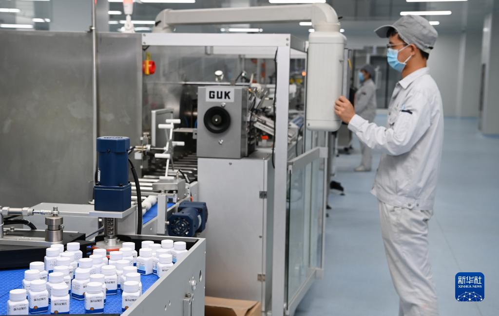陕西汉王药业股份有限公司员工在中药片剂自动化包装线上(9月20日摄)。汉中特殊的地理环境和气候条件,为研发、生产绿色中成药提供了得天独厚的条件。