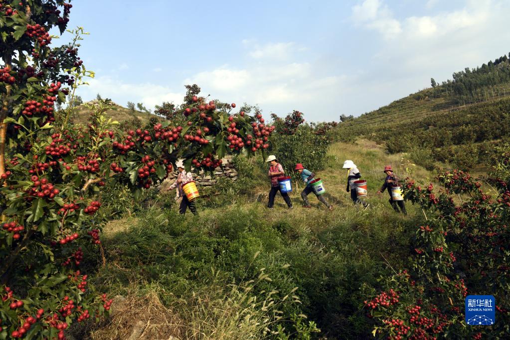 在山东省新泰市刘杜镇南流泉村,红彤彤的山楂挂满枝头,村民们忙着采摘、包装、交易。刘杜镇是远近闻名的山楂产地,全镇山楂种植面积2.3万亩。