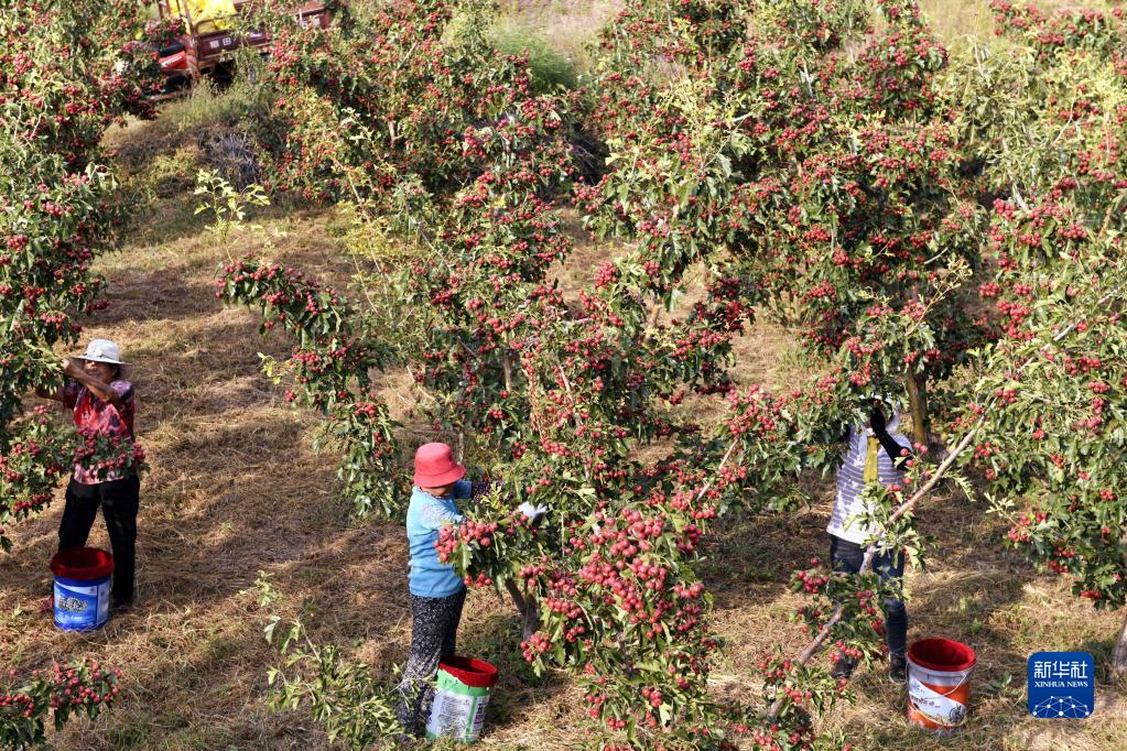 9月21日,新泰市刘杜镇极品山楂家庭农场的工人在采摘山楂。
