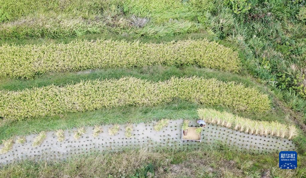 金秋时节,湖南省娄底市新化县紫鹊界梯田的水稻进入成熟收割期。紫鹊界梯田是世界灌溉工程遗产和全国首批19个重要农业文化遗产之一,梯田层层叠叠连绵起伏。