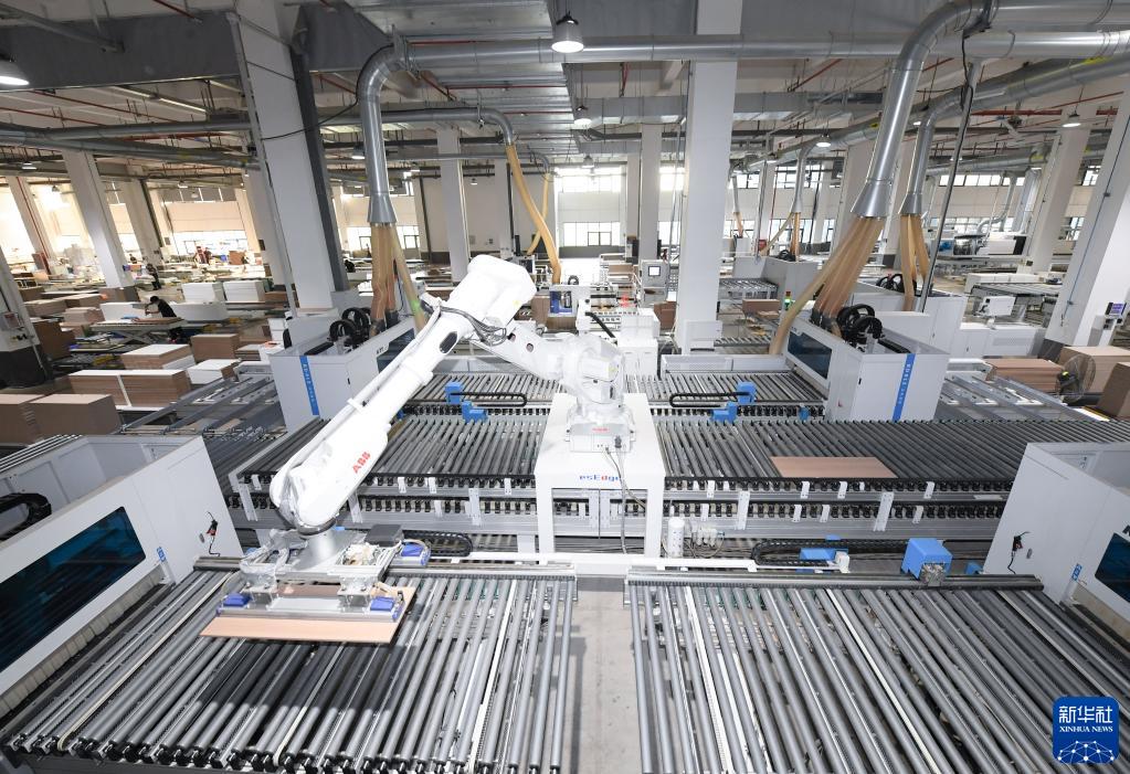9月22日,在位于安吉县的乐捷家居股份有限公司,机械臂在智能家具钻孔工作站分放板材。