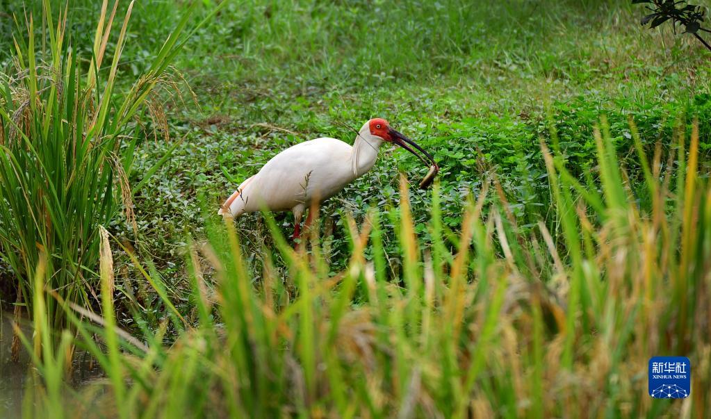 9月22日,一只朱鹮在洋县纸坊街道草坝村朱鹮保护区的稻田里觅食。