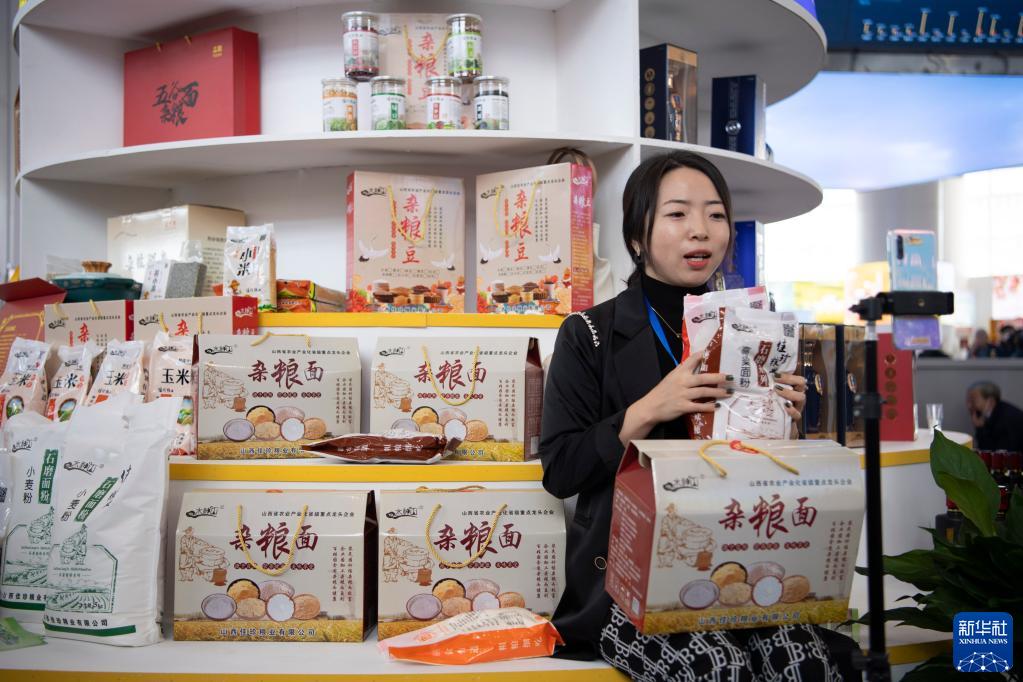 9月22日,一名参展商在位于山西省忻州市忻府区小檀村的杂粮产品展示展销展厅内进行直播销售。