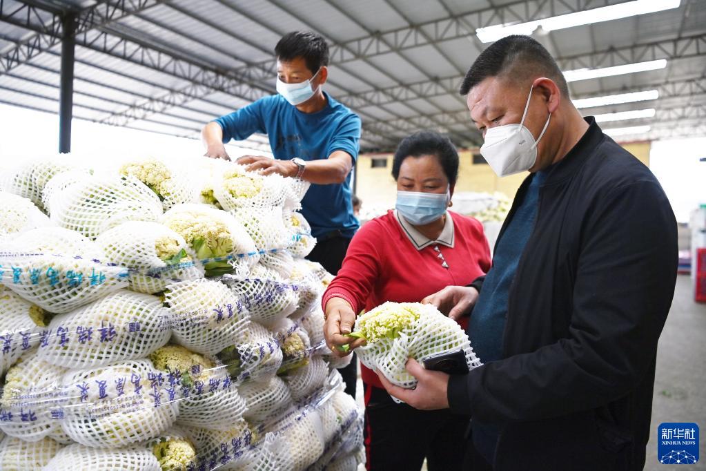9月20日,在榆中祥龙蔬菜产销专业合作社,豆俊兰(中)和商家查看蔬菜品质。