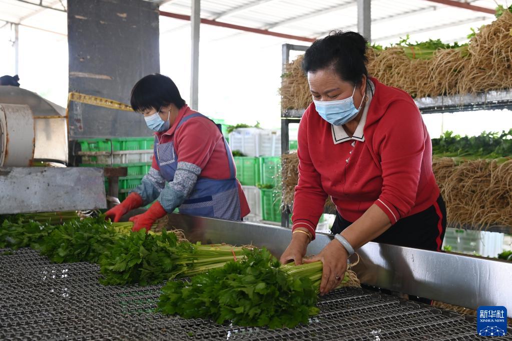 9月20日,在榆中祥龙蔬菜产销专业合作社,豆俊兰(右)在清洗作业线上整理芹菜。