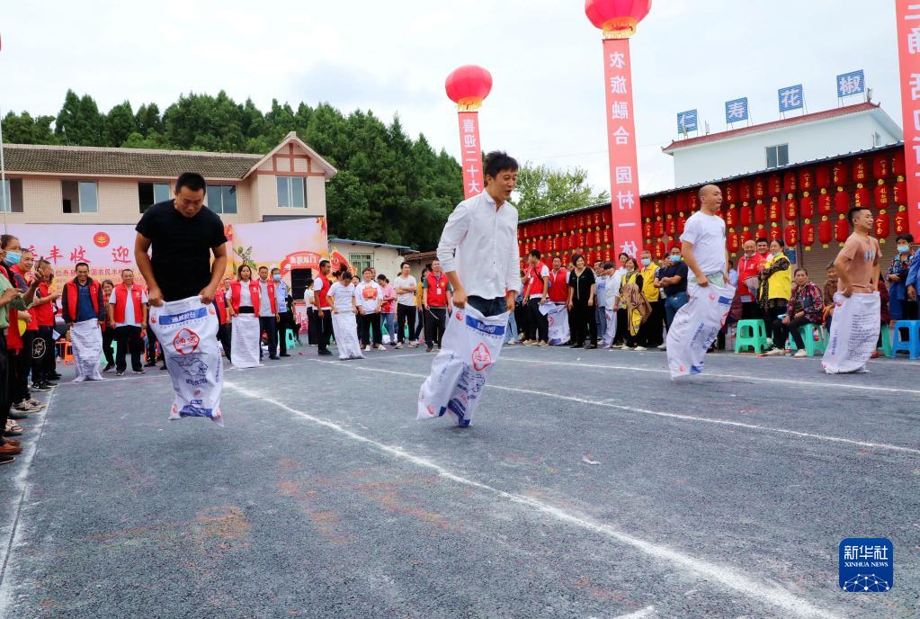 9月21日,在四川省眉山市仁寿县方家镇农民趣味运动会上,村民们参加跳粮袋比赛。