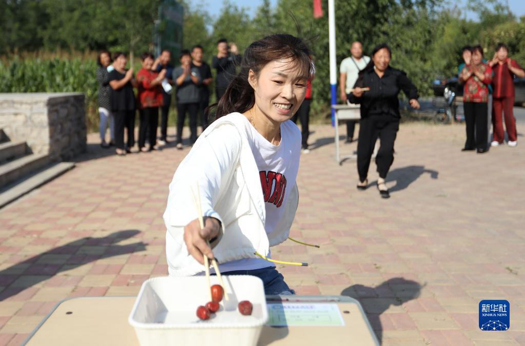 9月22日,河北省沧州市沧县村民在进行“筷子夹枣”比赛。