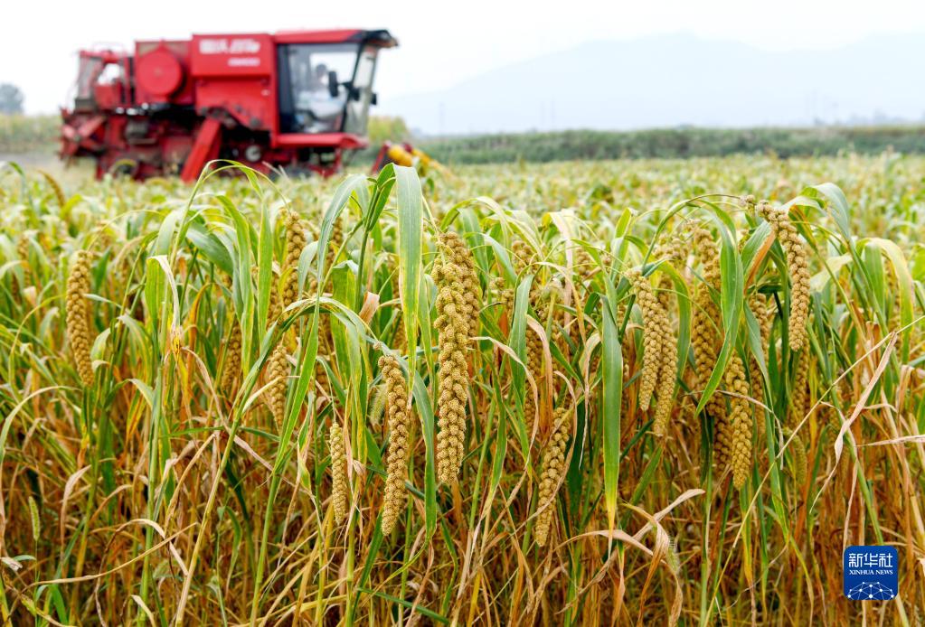 9月21日,在河南省洛阳市伊滨区寇店镇二教塔社区,收割机在地里收割谷子。