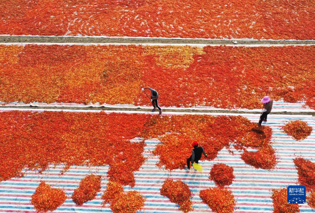 9月12日,安徽省亳州市谯城区古城镇油河村村民在翻晒辣椒(无人机照片)。