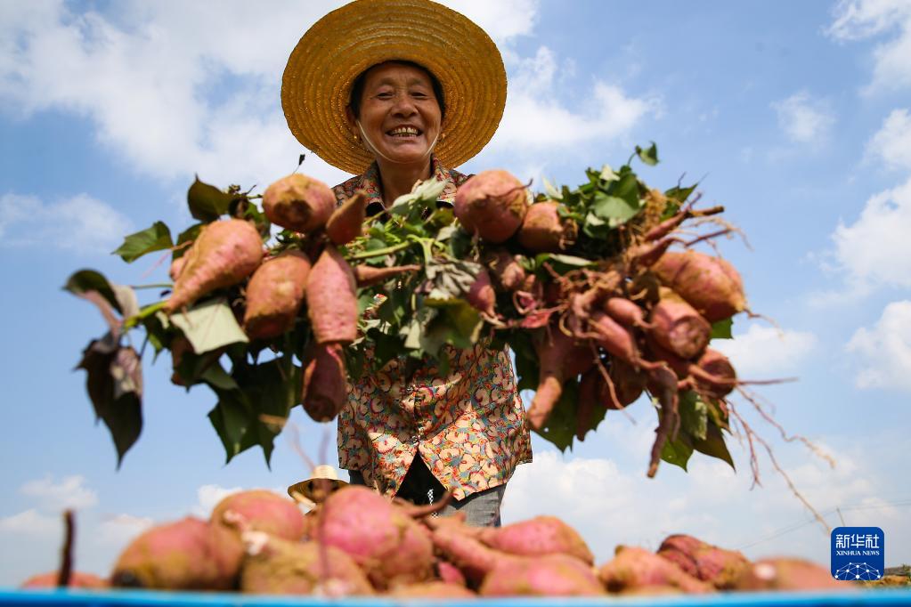 9月22日,江苏省句容市宝华镇仓头村村民在收获红薯。