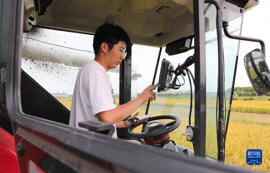9月21日,在上海浦东新区宣桥镇腰路村,技术员为一辆无人驾驶自动收割机调试运行参数。这个村的5G网络覆盖稻田,使得无人收割机可以快捷高效完成稻米收割。