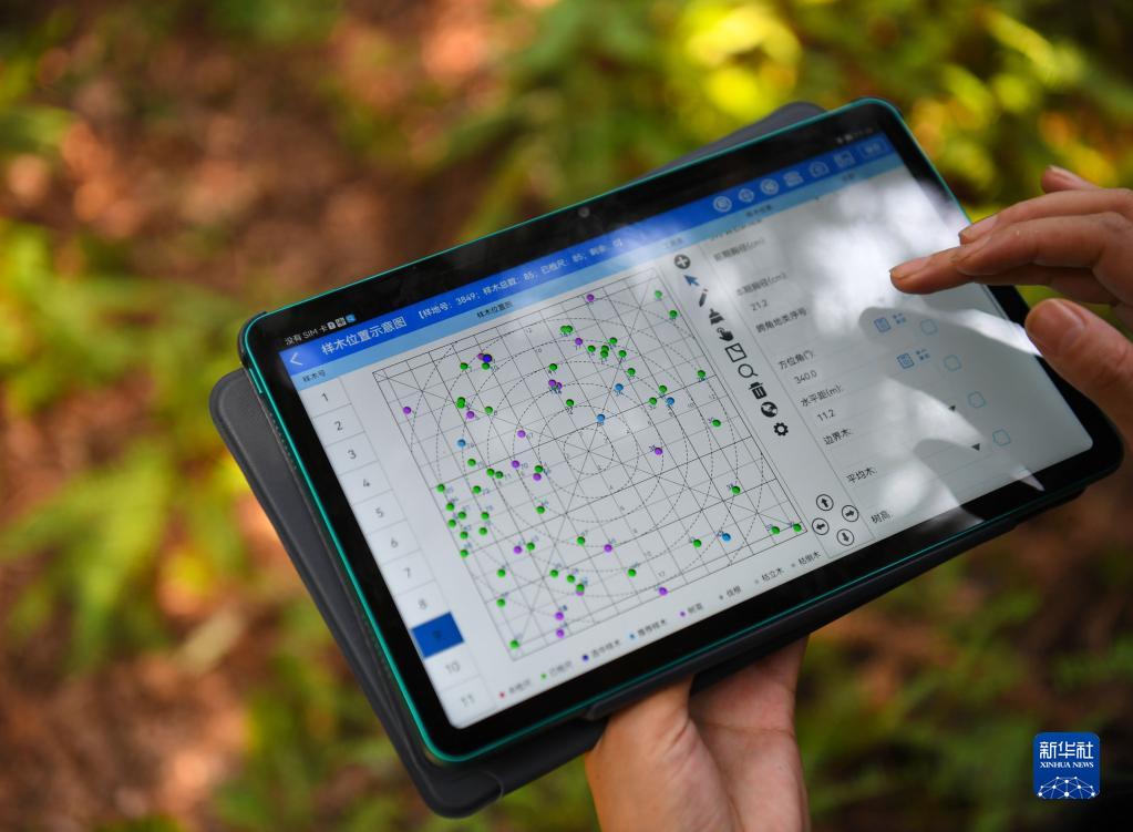 9月22日,在广东韶关乐昌市张溪村的生态监测样地,白拉曲珍查看软件数据。