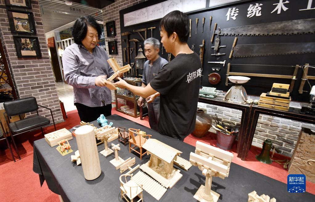 北京市朝阳区非物质文化遗产展馆馆长徐伟(左)为市民讲解传统木工的榫卯结构(9月22日摄)。