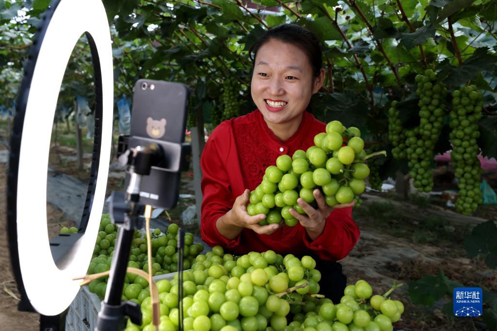 9月20日,在山东省枣庄市孟庄镇大郭庄村,“90后”牛玲玉在葡萄园直播平台上推介销售阳光玫瑰葡萄。牛玲玉大学毕业后返乡创办了畅想家庭农场,其种植的葡萄因属绿色食品备受消费者青睐。