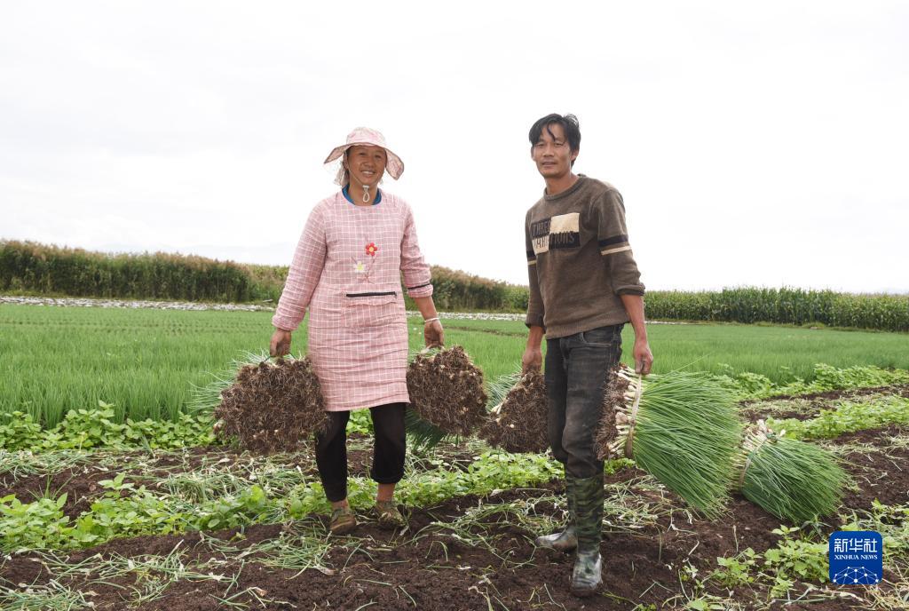 9月22日,在云南省丽江市玉龙县黄山街道的农田里,“80后”菜农杨志萍(左)和王晓林(右)夫妇在采收小葱。在租种的10多亩地上,夫妇俩主要种植小葱、白菜、莴笋等高原生态绿色蔬菜,今年预计收入10多万元。