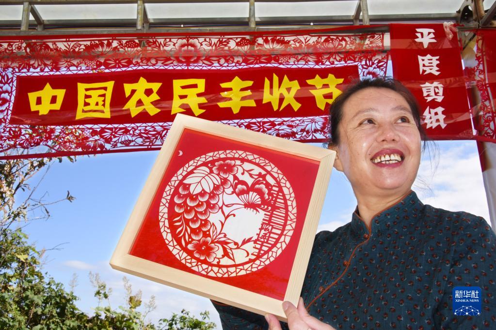 9月23日,剪纸艺人王海英展示丰收主题作品。