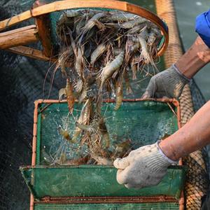 9月23日,丰盛湾水产养殖基地的工人在分装捕获的沼虾。