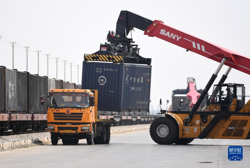 工作人员在兰州新区中川北站物流园装卸货物(2022年8月11日摄)。新华社记者 陈斌 摄