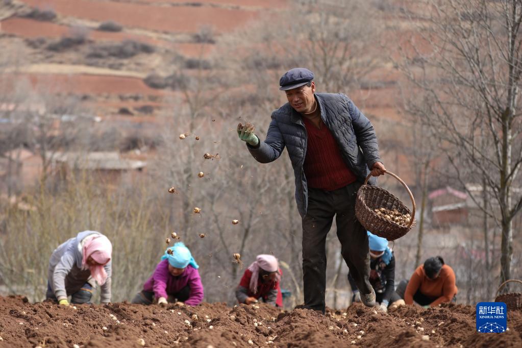 定西市渭源县元古堆村村民在播撒百合种子(2020年3月11日摄)。新华社记者 马希平 摄