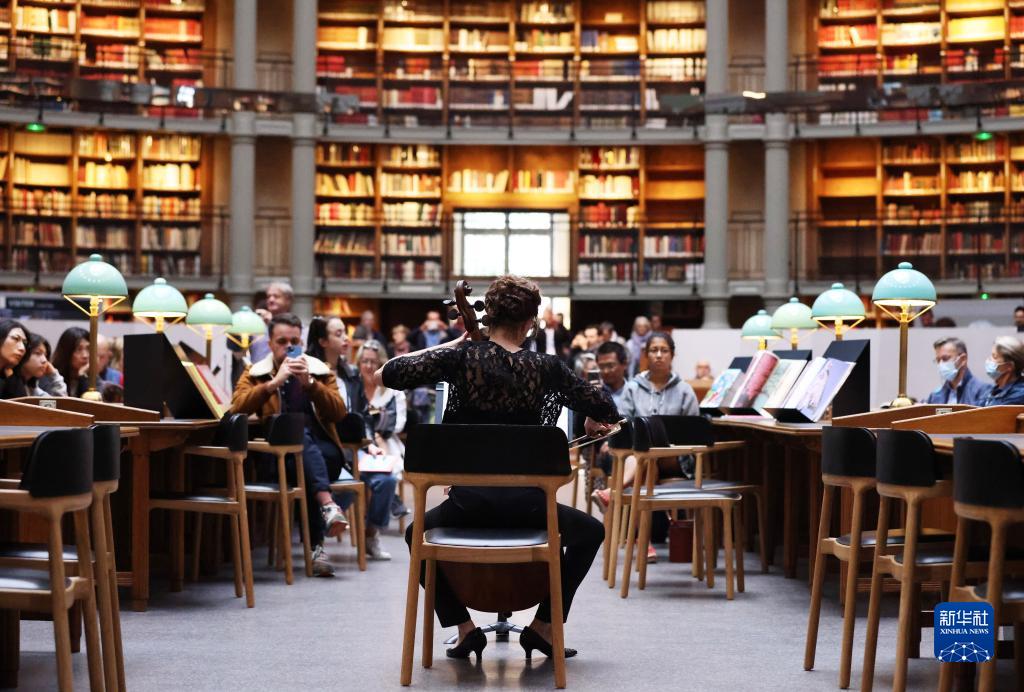 9月17日,在位于巴黎的法国国家图书馆黎塞留馆,人们在“椭圆大厅”聆听大提琴家的表演。