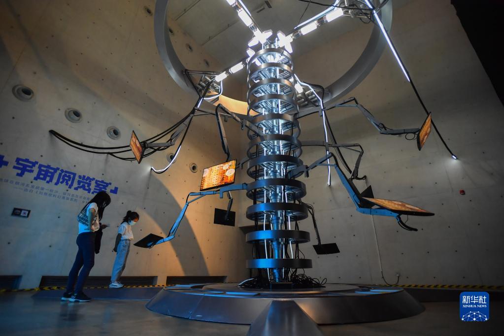 9月24日,参观者在“刘慈欣科幻漫画宇宙主题展”的宇宙阅览室展区观看展品。