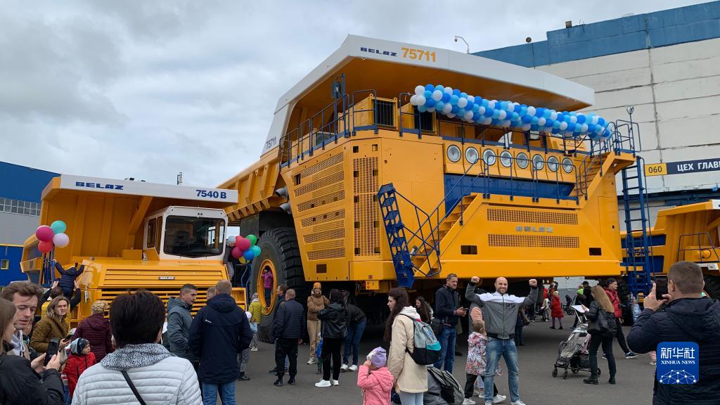 9月24日,市民在白俄罗斯明斯克州若基诺市的白俄罗斯汽车制造厂参观Belaz75711大型自卸车。